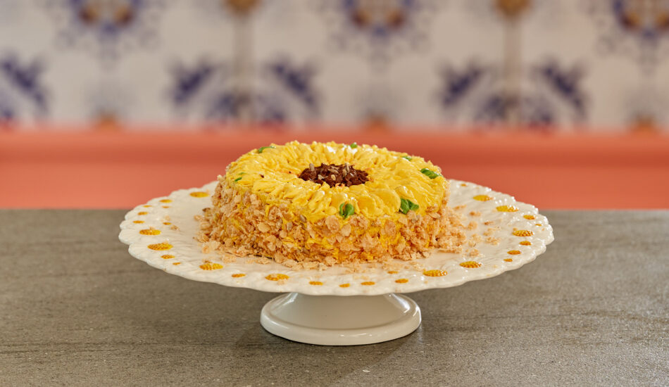 Deze amandeltaart wordt gevuld met een botercrème met likeur en sinaasappelcurd. Stapel alles op en maak bovenop een zonnebloem voor een schilderachtig resultaat.