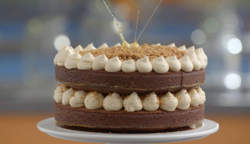Dit recept van Hans bevat 3 taartlagen. In de tent gebruikte hij er maar 2, zoals je op de foto kunt zien. Ook heeft hij van de druiptechniek afgezien, deze zit wél in dit recept. Wil je de taart liever maken zoals op de foto? Versnijd de 3de taartlaag tot smakelijke brownies en laat de druiptechniek achterwege.