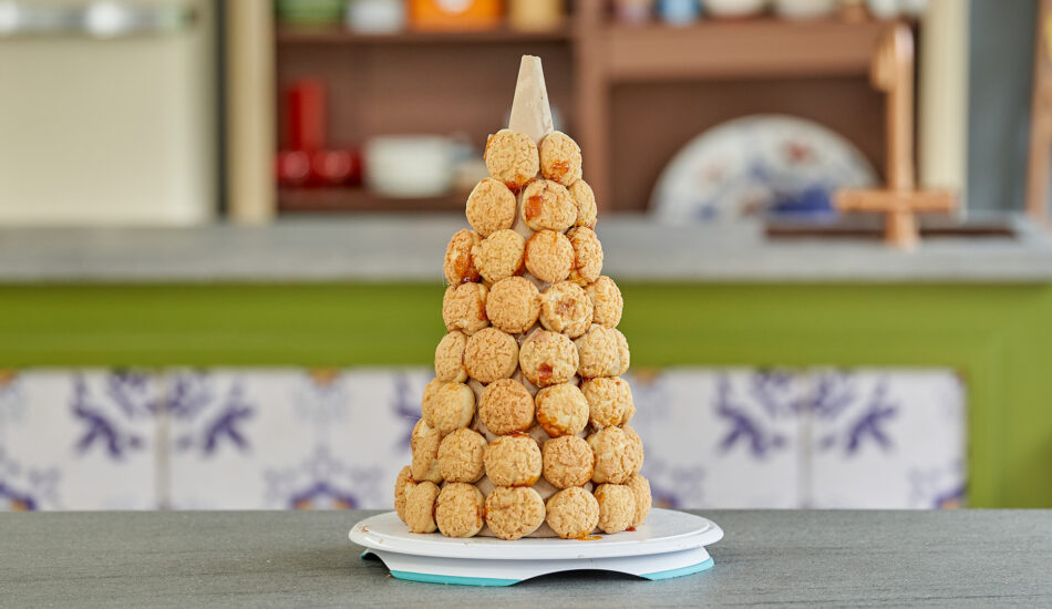 - Bouw zo de croquembouche op.