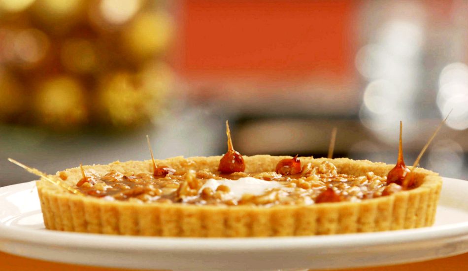 - Schenk vervolgens het kokoscrème-mengsel bij de gekaramelliseerde suiker en voeg walnoten toe. Roer goed en verdeel over de taartbodem.