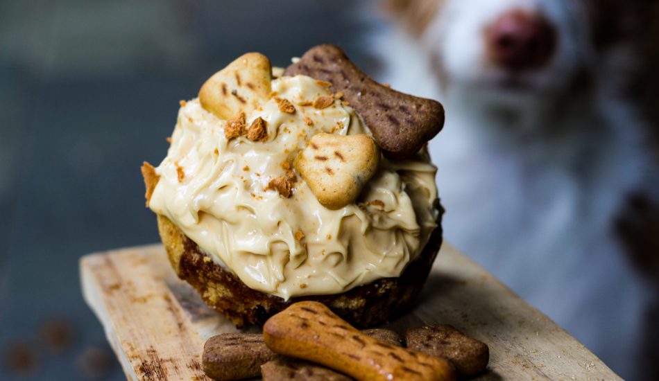 - Laat afkoelen en versier de taartjes met hondenpasta en hondenkoekjes naar keuze.