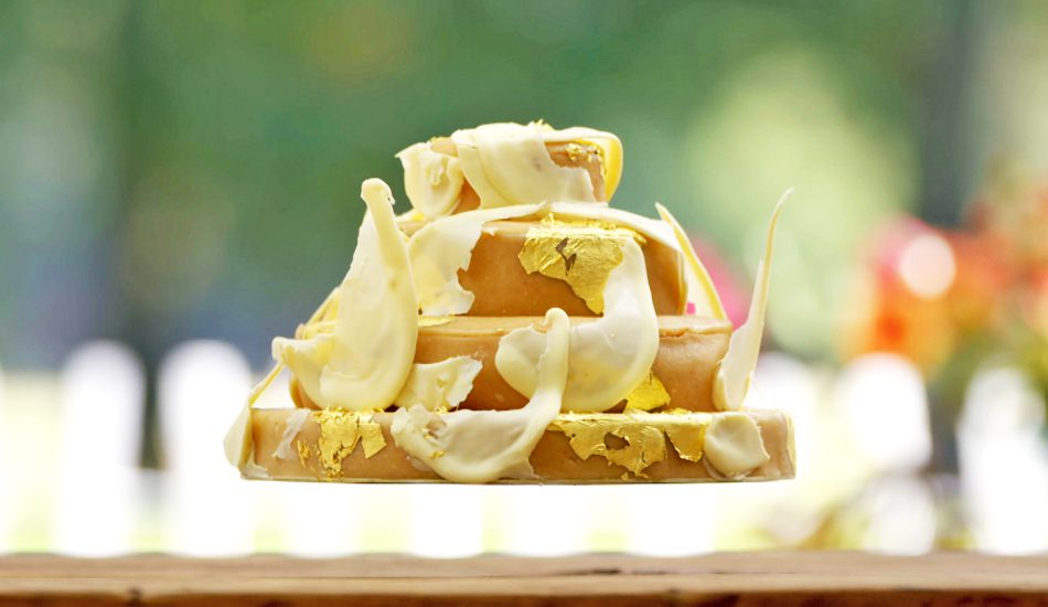 - De opgesteven taart bekleden met marsepein en de taart met decoratie en bladgoud afwerken.