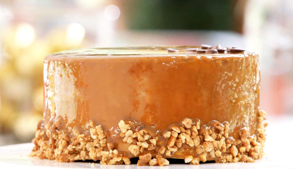 - Zet de taart op het taartplateau en verdeel de gekarameliseerde nootjes over de onderste helft van de taart.