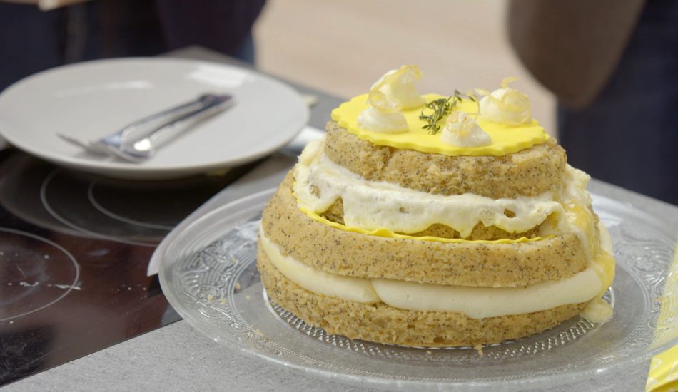 - Smeer een dun laagje botercrème op de bodem van de taarten zodat de curd er niet te veel intrekt. Spuit aan de rand een dijkje botercrème – schep de lemon curd er ruim op. Sluit af met de andere helft van de taart. Doe dit drie keer maar stapel de taarten nog niet op.