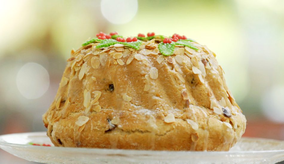 - Garneer de tulband met glazuur, geschaafde amandelen en de marsepeinen vormpjes.