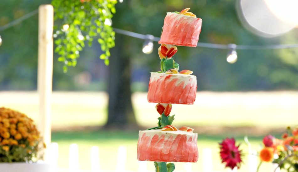 - Decoreer de taart met fondant, chocolade tulpen (chocolade uit lepels), blaadjes en stengels.